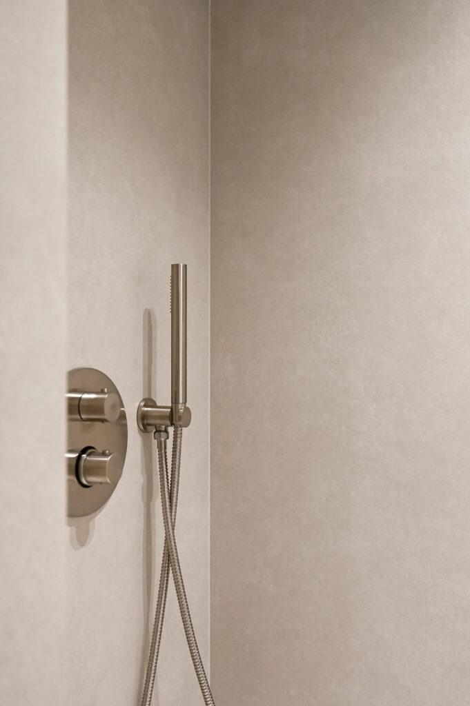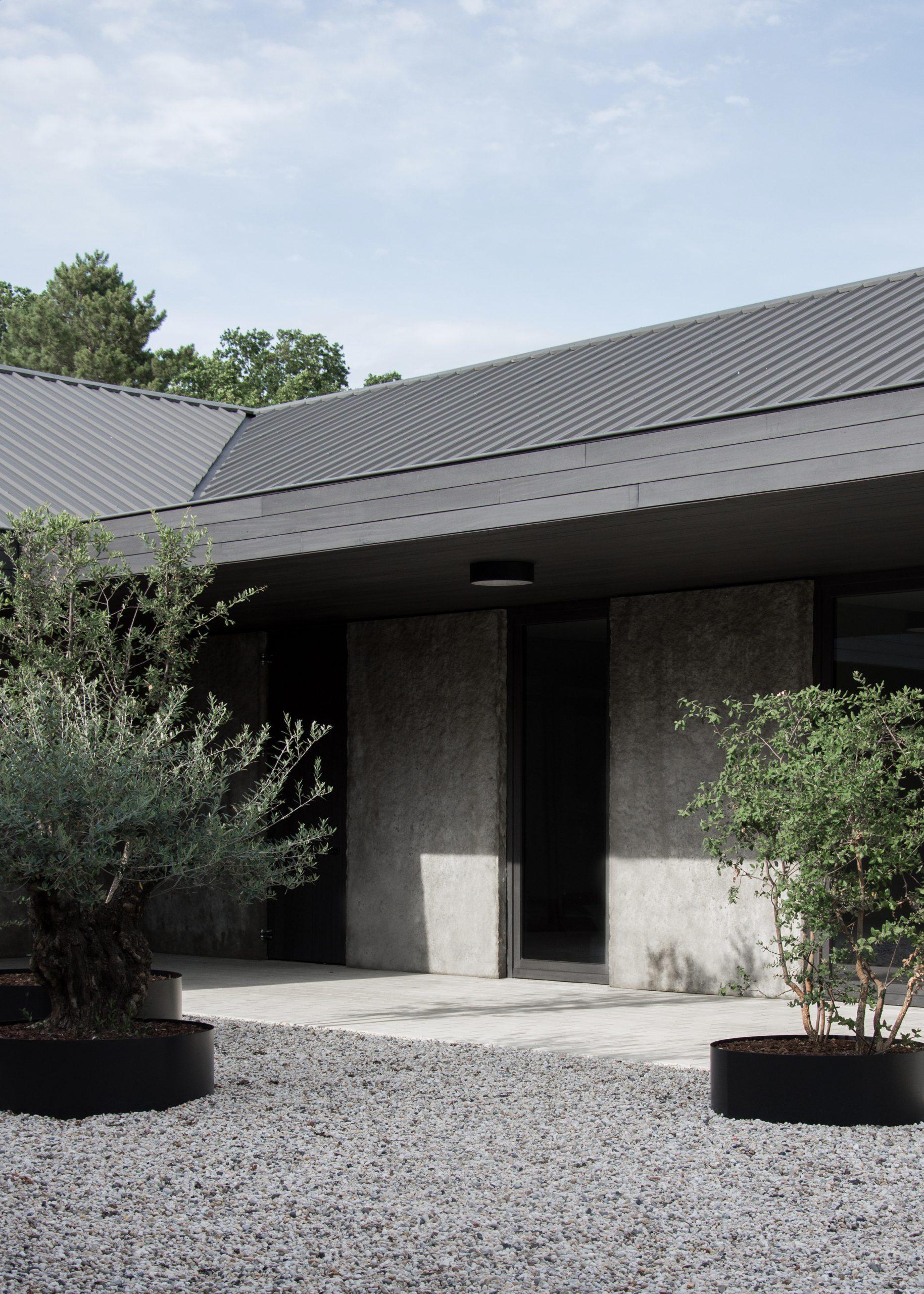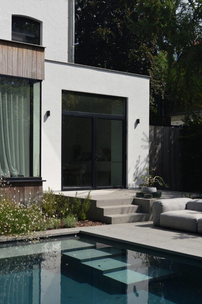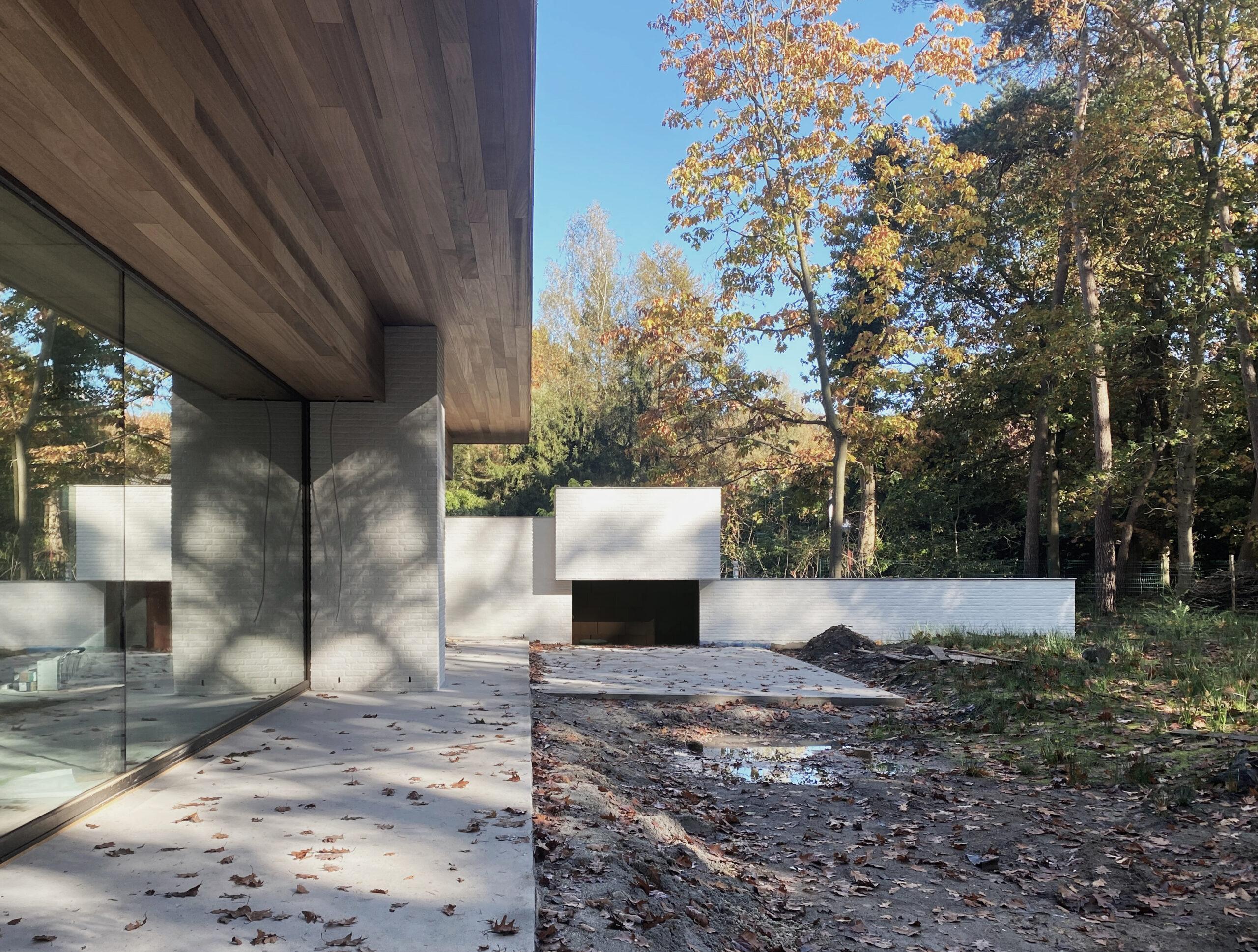 De pijlers zijn uitgevoerd in metselwerk, met een sobere, terugkerende detaillering doorheen het hele project. Ze dienen het leven en geven het richting. De massiviteit van de muren wordt tevens ingezet voor de integratie van de technieken. De geothermische warmtepomp en zonnepanelen, verborgen achter een dikke dakrand, maken de woning tot een duurzaam geheel.