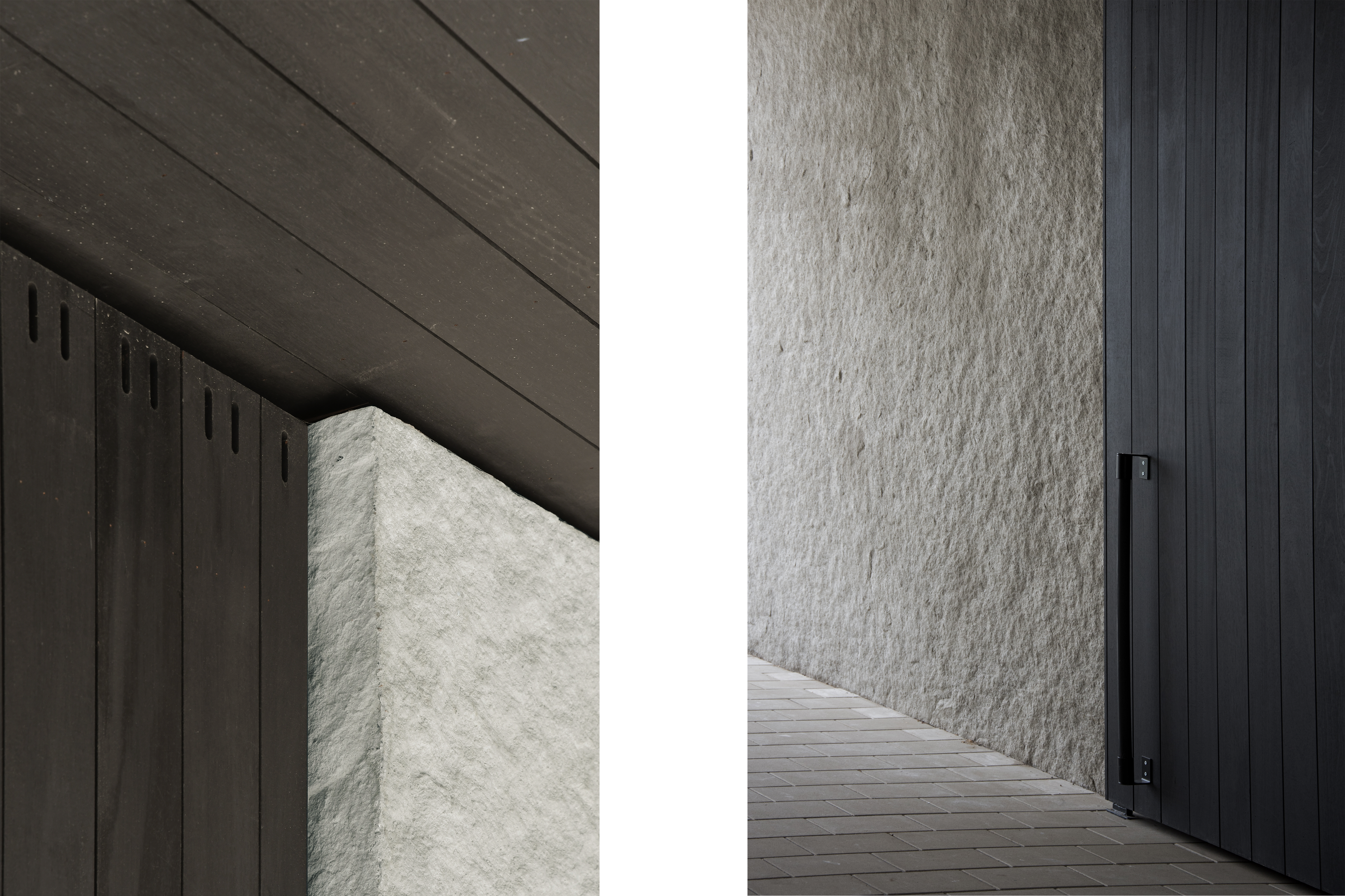De open leefruimte, waar de massieve pijlers rond zijn verzameld, wordt omsloten door een houten dak dat alles verbindt tot een geheel. Het stenen metselwerk en klinkers, het houten parket en binnenschrijnwerk en de vliesgevel, dat de verschillende volumes verbindt, maken een heel leesbare woning.